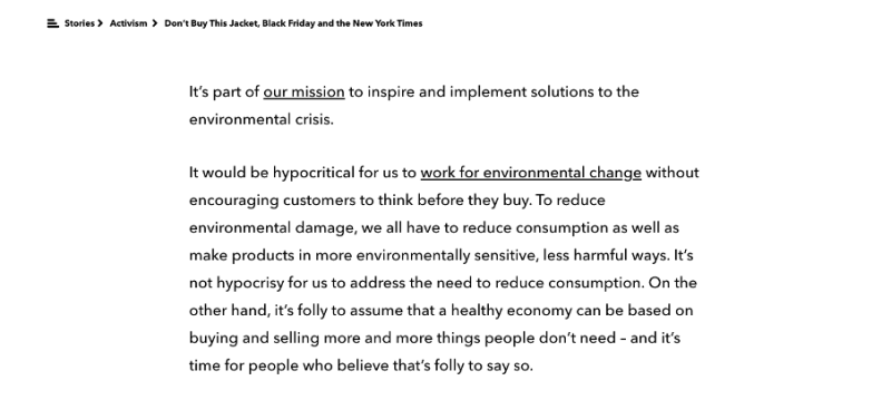 Ci-dessous, la marque Patagonia revient sur sa publicité en s’adressant à ses consommateurs pour décrire les conséquences de la surconsommation et les inviter à repenser leurs habitudes de consommation notamment d’objets dont ils n’ont pas nécessairement besoin.